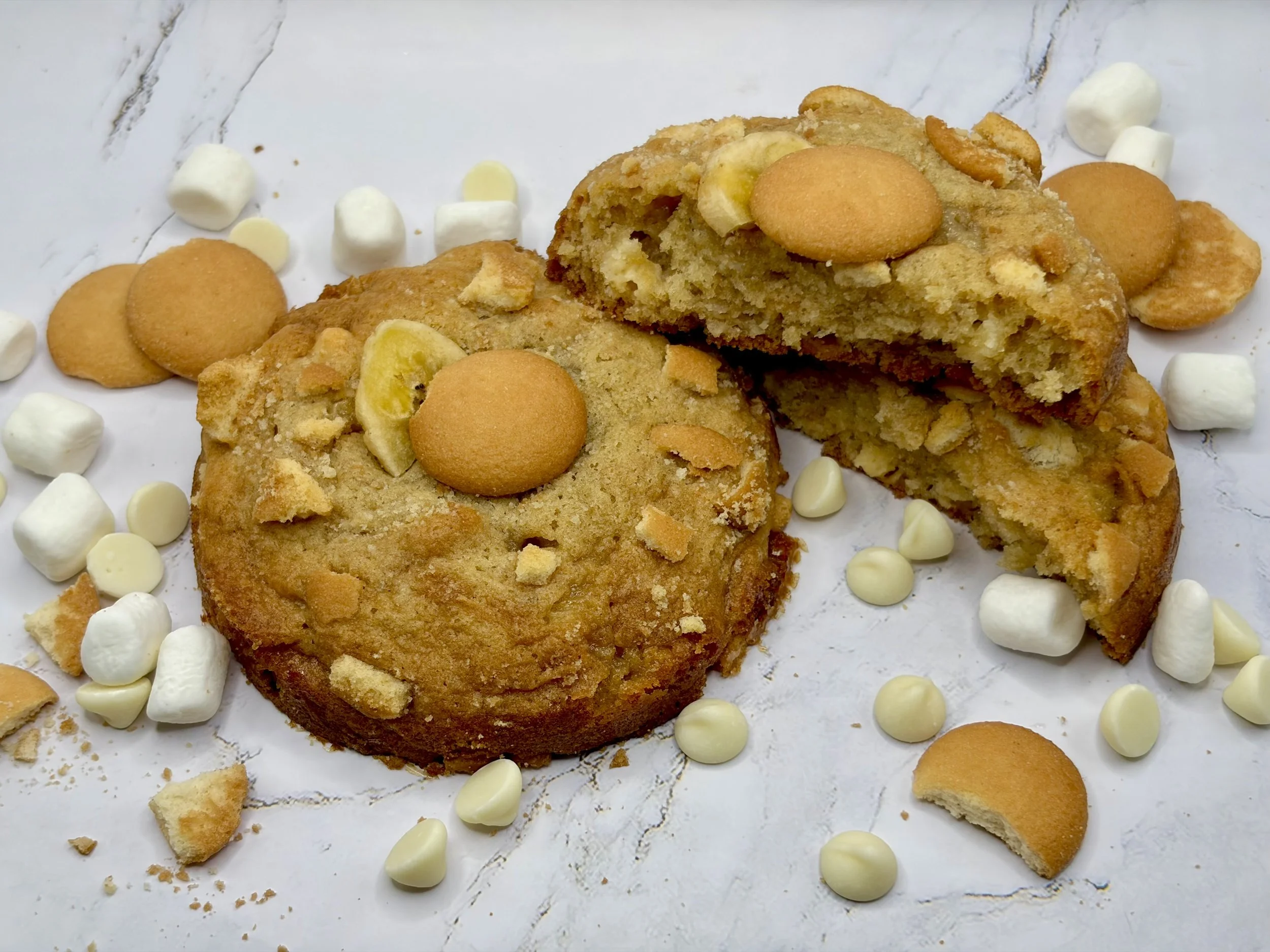Our classic dough blended with mashed bananas & creamy banana pudding, then mixed with crunchy Nilla wafers, creamy white chocolate chips, & gooey marshmallows for that perfect nostalgic combination of sweet & fluffy.