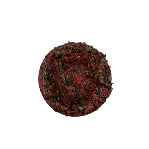 Decadent, moist, red velvet dough enrobed with dark chocolate Oreo pieces & a whole Oreo in the center! Drizzled with dark chocolate, Oreo crumbs, & red sprinkles — just what the love doctor ordered.